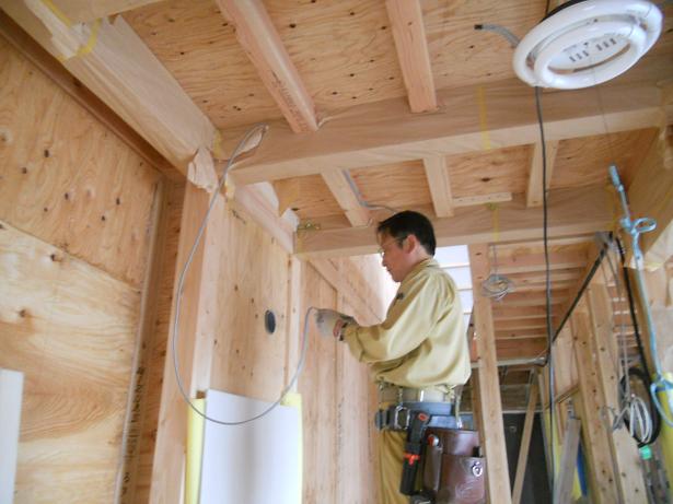 電気屋さん配線工事中 化粧梁が多いので、色々考えながら・・・・