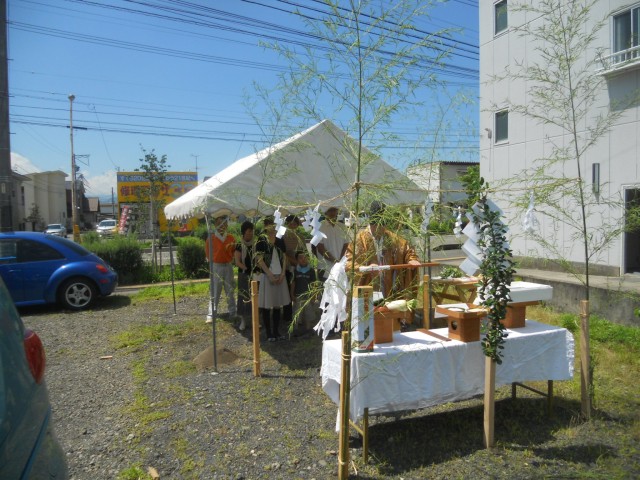 吉田・運動公園通り沿いにモデル住宅の着工を始めました。 お天気も良く、気持ちのいい地鎮祭ができました。
