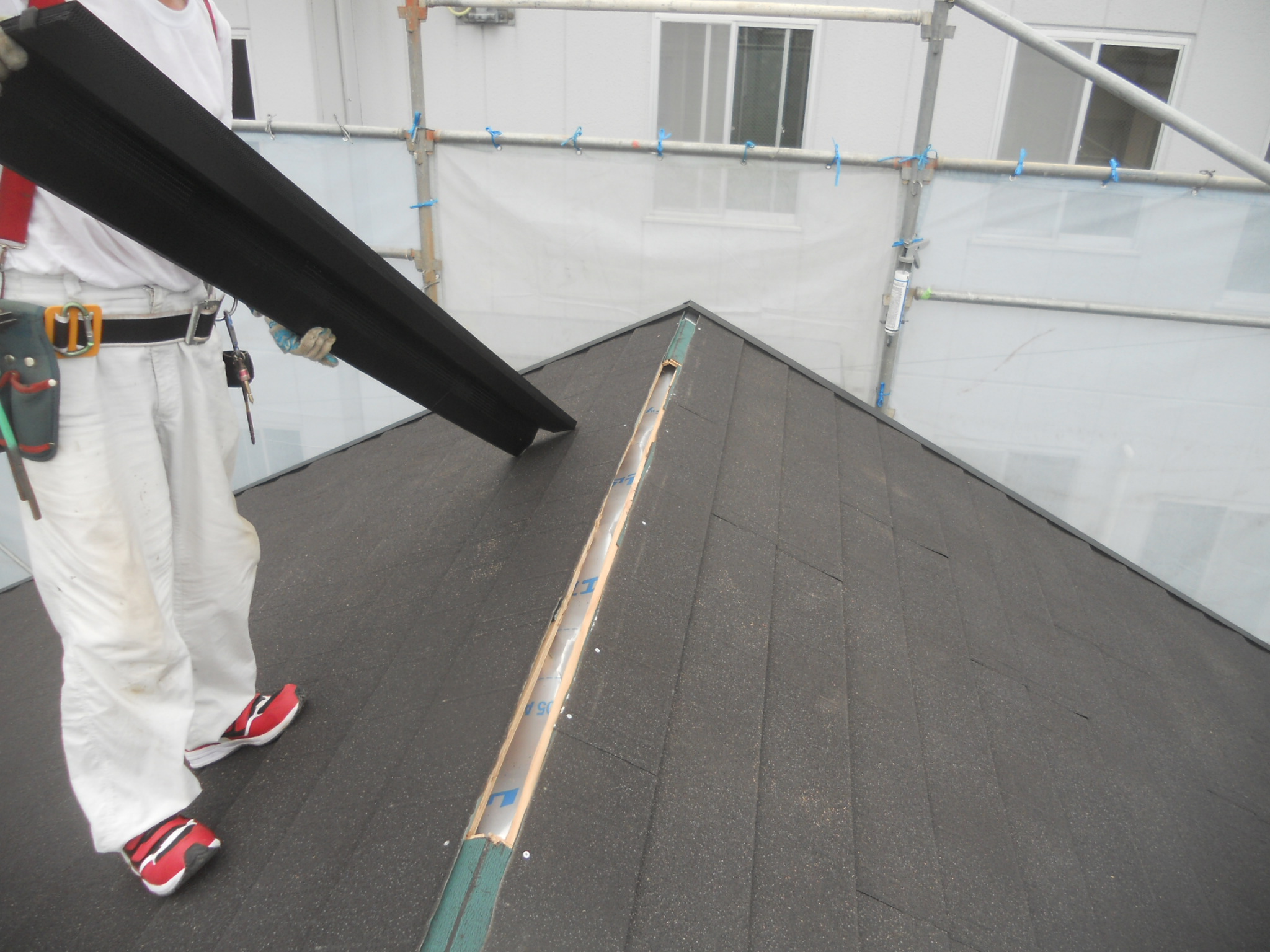 屋根の二重通気層のうち、遮熱シート上の換気。職人さんの持っているのはリッヂベンツ。