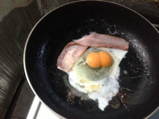 PS.今朝の我が家のフライパンです。なんと双子の卵でした。