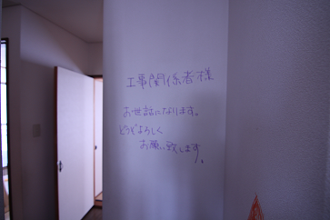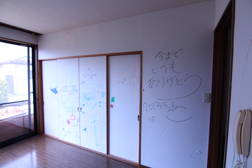 こんな落書きを見つけ、長年住んだ家への思いが伝わってきて胸が痛くなりました。 そして最後に子供たちが、思いっきり壁に落書きさせてもらったのかな。 いつもならダメな壁への落書きを、嬉しそうに書いている姿が目に浮かびました。