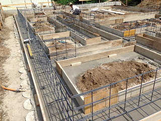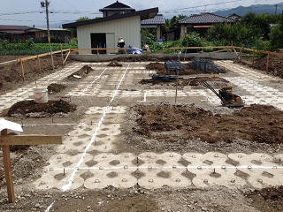 もうすっかり敷き終わって、その上にいつもの基礎工事が始まりました。