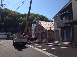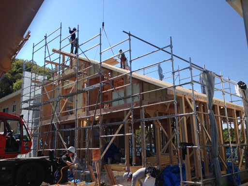 昨日と今日で松代の代官町という、自然に恵まれたところで建前中です。 昨日は怪しい天気でしたが、パラパラと雨が当たったくらいで何とか大丈夫でした。 レッカーもたった一日で終わるくらい順調でした。 今日は昨日に引き続き風は強いですが、着々と出来上がりつつあります。 何回見ても木の家は香りといい、見た目といい最高です。 完成は7月の予定です。お楽しみに!!