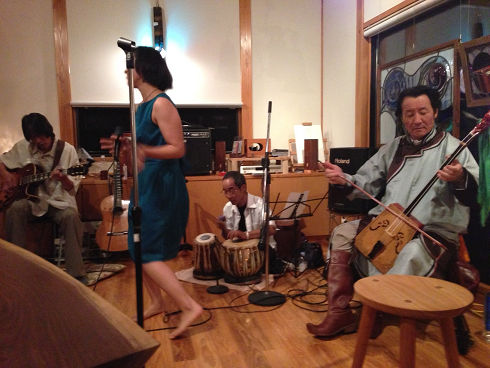 最初はMAIさんのアカペラ、次に民族打楽器とギター、次にベース、馬頭琴が加わって、会場は豊かな音に包まれました。MAIさんの声が心に響きます。