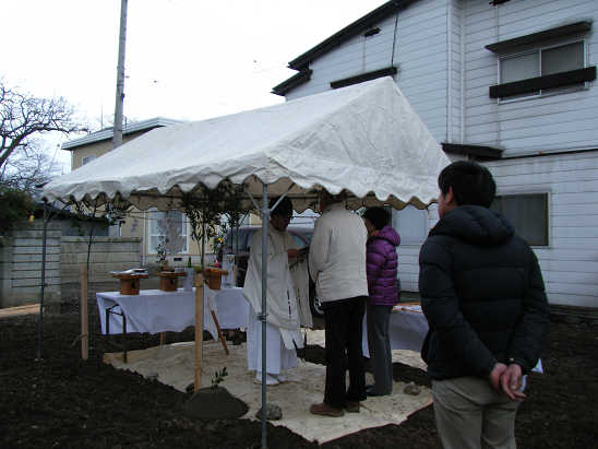 昨日の晴天から信じられないくらいの寒さの中、本日地鎮祭を行いました。 暖かさに慣れてきた体には、風が強かったのも手伝って体感温度が倍増でした。 ヤマワの地鎮祭は好天が多いのですが、朝の吹雪に比べれば止んではいましたので良しですね。