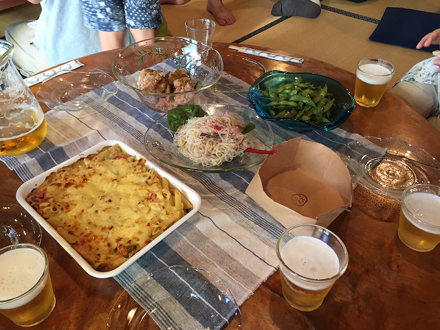 ビーフン・味付け枝豆・から揚げ・角煮・マカロニグラタン・チーズの盛り合わせ・あさりの炊き込みご飯など盛りだくさん。味付けに工夫がされていて、どれも絶品の美味しさ。おまけにガラスのうつわが映えて美味しさ倍増でした。