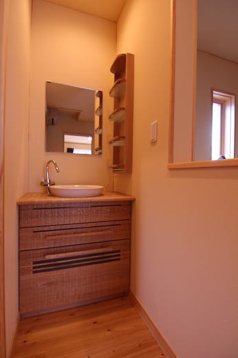 手洗いは引き出しと棚を「タモ」という材料で作りました。