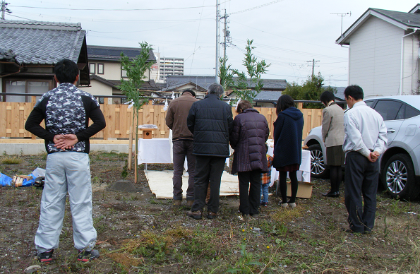 日曜日、11月にしては暖かな中で地鎮祭を執り行いました。 今年9棟めの地鎮祭で、事務所に近い中越の現場です。 素敵なご夫婦と可愛い娘ちゃんと可愛い男の子ちゃんのご家族です。 二礼二拍手も上手に出来ました。