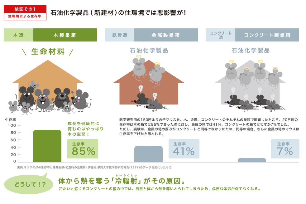 なぜこんな結果がでたかというと、実は体から熱を奪う冷輻射(れいふくしゃ)が原因なんです。金属やコンクリートなどは体の熱を奪ってしまいます。その点、木の家は暖かく生物にとってとても良い住環境といえますね。
