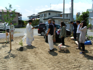 おととい長野市小島で地鎮祭を行いました。 梅雨真っ最中のはずが快晴のなか、紫外線をたっぷりと浴びながら執り行いました。 今回は大人数で、神主さんも合わせると13人+愛犬パグと工事の無事をお祈りしました。 ワンちゃんは暑さが苦手らしく、小さな日陰でハアハアしていてほほえましかったです。 室内犬ですので、ヤマワの快適な家に家族の一員として住みます。羨ましい!
