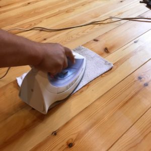 2.次は補修の作業。目に付いた傷を補修していきます。このとき使うのが普段洋服に使うアイロンと濡らしたタオル(雑巾)!