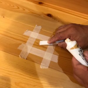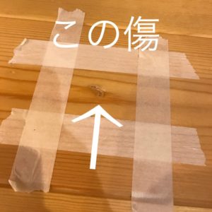 この傷をパテ埋めしてみましょう。分かりやすいようにマスキングテープで囲っています。